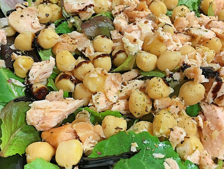 Lavaremos los garbanzos y los calentaremos un par de minutos en el microondas, los repartiremos por encima de la ensalada y añadiremos el salmón desmenuzado en los dos platos.