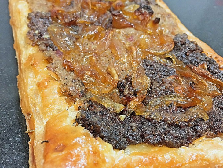 Sacamos el hojaldre del horno y vamos disponiendo un poco de butifarra negra y a su lado la blanca hasta que lleguemos al otro borde del hojaldre. Horneamos de nuevo unos 10 minutos y al sacarla del horno es cuando añadiremos un poco de cebolla caramelizada por encima. Si os gustan los piñones es el momento de esparcilos por encima.