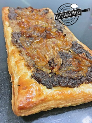 Hoy os quiero proponer una receta fácil pero a la vez con un toque innovador, simplemente formaremos una banda de hojaldre que en ella pondremos tiras de butifarra blanca y negra trituradas y encima el toque innovador, cebolla caramelizada. También podrías añadirle como toque final unos piñones por encima, aun la hará más buena, vamos a ello!