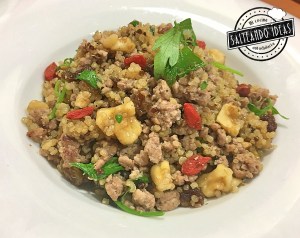 Una vez tenemos la ternera cojiendo color añadimos las pasas y las nueces troceadas, mezclamos muy bien y sal pimentaremos, dejamos un minuto, el minuto que nos servirá para calentar al microondas los vasitos de quinoa. Cuando estan calientes los vertemos en la sartén y seguiremos removiendo bien para que todos los ingredientes se integren.
