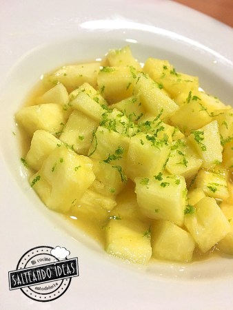 La mezcla de los sabores acidos que aportan la naranja y la lima chocan perfectamente con el dulzor de una piña madura y la delicadeza que le añade la miel, os aseguro que la boca disfruta con estas discusiones entre sabores y juntos crean un plato fresco y veraniego para este calor que empieza a acecharnos.