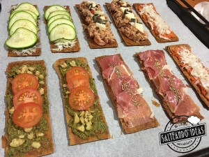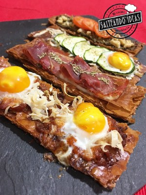 Nota: yo he cortado las porciones después de hornear la placa entera, con mucho cuidado y con un buen cuchillo de sierra suave, pero firmement os aconsejo que cortéis antes las porciones por si luego se os rompen.Una vez tenemos el hojaldre bien dorado, lo retiramos del horno y empezamos a montar las tapas a nuestro gusto. Si hacéis alguna que necesita cocinarse después, simplmente calentad el horno antes y luego volvéis a meter las placas con sus ingredientes, eso si, que pueda ser rápido como huevo de codorniz, queso fundido etc… porque sino luego las placas se os podrian quemar por la parte inferior.