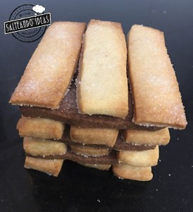 Cortamos rectángulos iguales y los vamos poniendo encima de la bandeja del horno forrada con papel de hornear. Haremos el mismo proceso con la otra masa hasta terminar las dos.