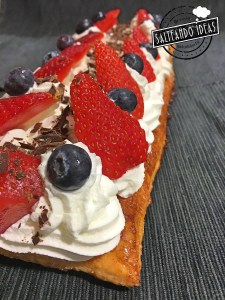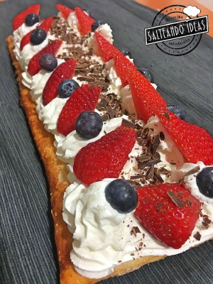 Cogemos la mitad de la nata montada y la introducimos dentro de una manga pastelera con una boquilla en forma de estrella (la que queráis, a mi me gusta variar) y la vamos disponiendo encima de las dos bandas de hojaldre, de un lado a otro. Luego hacéis unas pequeñas montañas intercaladas que sera donde pondremos las fresas y en medio de ellas los arándanos o la fruta roja que hayáis elegido.