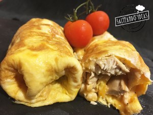 Cuando la sartén está bien caliente añadimos el huevo batido y cogiendo la sartén por el mango moviéndola un poco para que el huevo llegue a todos los rincones, como si hiciéramos una crep. Disponemos una loncha de queso cheddar en medio y un poco del pollo cocinado, lo cubrimos con una tapadera y esperamos medio minuto. Cuando ya vemos que el huevo se ha cocinado por encima con cuidado lo vertemos encima de un plato y formamos el burrito. El lateral de la derecha e izquierda los doblamos hacia dentro y luego cogiendo el lateral de abajo lo enrollamos y le damos la vuelta.