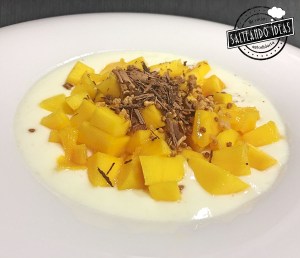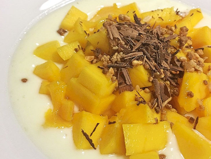 Nos hacemos con dos platos con un centro hondo y vertemos la mezcla de yogur y chocolate en ellos. Disponemos encima daditos de mango, un poco de almendras troceadas y finalmente un poco de chocolate rallado con un cuchillo pequeño.