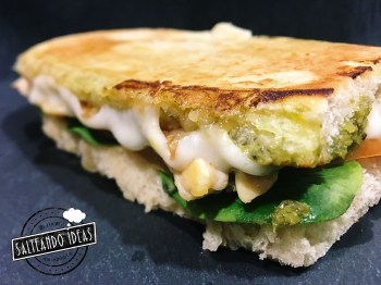 Una vez tenemos el pollo cocinado, damos la vuelta a la parte de abajo del panino y empezamos a montar el sandwich. Ponemos unas hojas de espinacas o rúcula, encima el tomate, luego el pollo, el jamón serrano y las lonchas de queso. Untamos con salsa pesto la parte interior del pan con el que taparemos el panino. Lo tapamos y ponemos algo de peso encima para que el pan se aplaste.