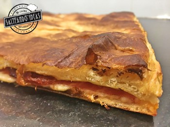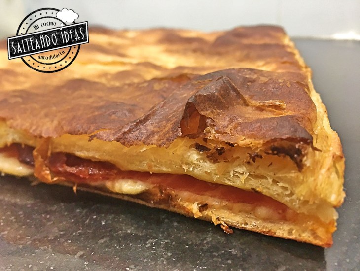 La única variación que hay con una pizza normal és que a esta pizza se la cubre con una capa encima de masa que és hojaldre. Esta capa lo que hace es tapar el relleno y así queda más tierno, al no estar expuesto al calor no se seca con el horno. Podemos decir que es otra manera de hacer calzone jajajaja