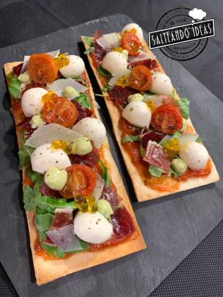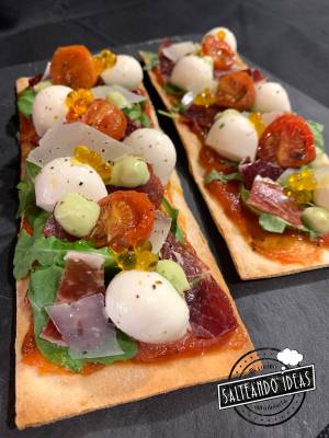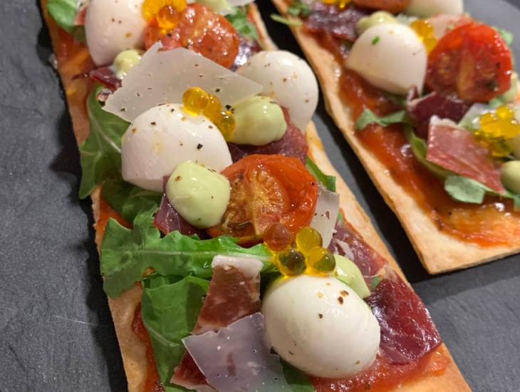 Cogemos un rectángulo tostado al horno y esparcimos un poco de salsa de tomate. Encima unas hojas de rúcula, seguido de unas finas lonchas de jamón ibérico. Pondremos cinco bolas de mozzarella de búfala, un poco de finas lonchas de queso curado. Intercalamos con unos montoncitos de crema de aguacate, unos tres tomates confitados y finalmente 2 o 3 bolas de caviar de aceite.