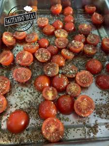 En una bandeja de horno ponemos aceite, el romero y los ajos troceados. Seguidamente añadimos el vinagre, un poco más de aceite y pimienta. Encima los cherrys con el resto del aceite y cocinamos durante 1 hora y ½ a 120º.
