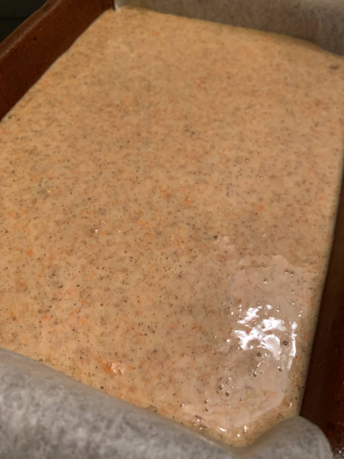 Forramos con papel de horno un molde rectangular de unos 25 cm de largo y vertemos dentro la masa.