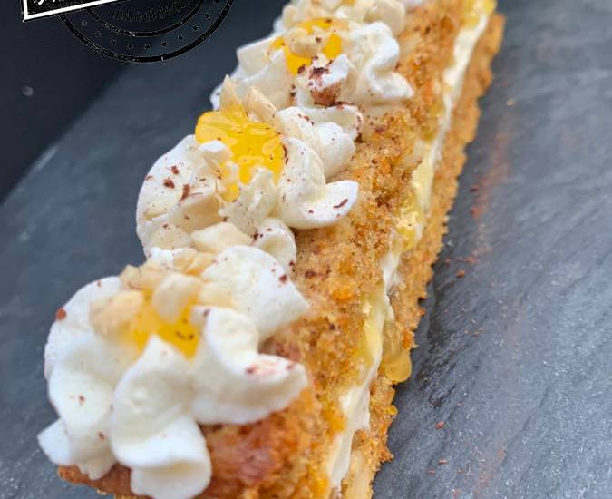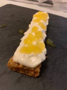 Con unas pinzas ponemos unos dados de gelee por encima de la cada flor y terminamos el plato con polvo muy sutil de canela por encima de la carrot cake.