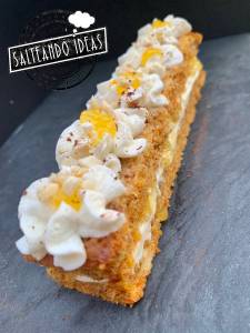 Empezamos a montar a velocidad rápida y a mitad del proceso añadimos el azúcar glass. Terminamos de montar hasta obtener un buen pico. Ponemos la mezcla en una manga pastelera con una boquilla de flor, reservamos en frío.