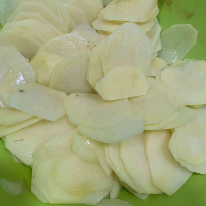 Vamos poniendo las patatas laminadas sin dejar hueco entre ellas, cada dos capas echamos un poquito de sal, así hasta terminar con todas las laminas.