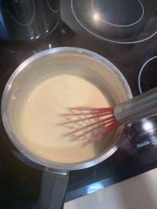 Sin dejar de remover agregamos la leche hasta que llegue a ebullición a fuego medio. Cuando la salsa ya nos está hirviendo, bajamos el fuego y