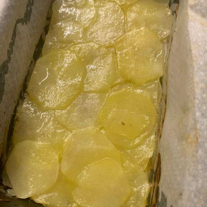 Limpiamos y pelamos las patatas. Las cortamos con una mandolina o máquina de cortar embutido al 1,5 de grosor, las vamos secando. Forramos una bandeja de horno pequeña con papel de hornear, yo he utilizado un molde para pan o pancake para que quedara una altura considerable.