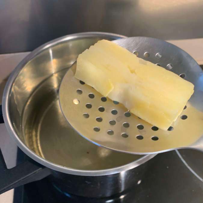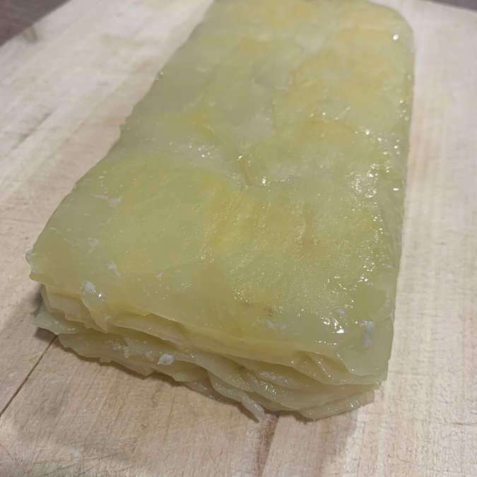 Cuando están completamente frías las desmoldamos, pulimos los bordes y cortamos por la mitad de arriba abajo. Ahora hacemos cuadrados iguales y estos los partimos en diagonal formando triángulos.