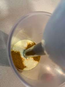 Nos hacemos con un vaso hondo de la batidora de inmersión. Ponemos el huevo, el aceite, la pizca de sal y la miel. Ponemos la batidora tocando el fondo del vaso. Empezamos a batir sin mover durante 10 segundos, luego ya podemos empezar a hacer movimientos suaves hasta que lo tenemos todo bien integrado. Ponemos las dos cucharaditas de curry y mezclamos con una espátula. Disponemos la mayonesa en una manga pastelera y a la nevera.