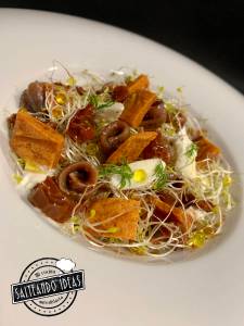 Nos hacemos con un plato hondo. Disponemos un poco de alfalfa, encima desmigamos la burrata. Añadimos trocitos de tomate seco y las anchoas partidas por la mitad y enrolladas. Aliñamos con la vinagreta de tomate y terminamos de decorar el plato con cuadraditos de la coca de parmesano y un poco de caviar.