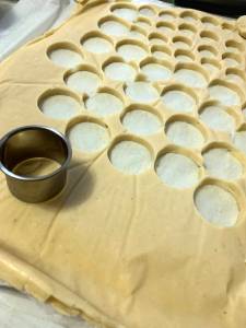 Precalentamos el horno a 180o. Pasada la hora, cortamos galletas de la medida redonda deseada y las vamos disponiendo en la bandeja del horno junto con papel de hornear en la base. Horneamos entre 10 y 15 minutos, hasta que tengan un ligero color dorado en los bordes, sacamos y dejamos enfriar. Reservamos.