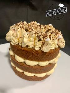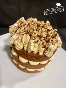 Una vez tenemos esto ya podemos empezar a montar la tarta. En los dos pisos inferiores usaremos la manga pastelera con la boquilla redonda, primero el lateral y luego el interior. Para la capa superior usaremos la boquilla de rosa. Espolvoreamos con la ayuda de un colador un poco de cacao por encima y un poco de virutas de chocolate negro, listo!!