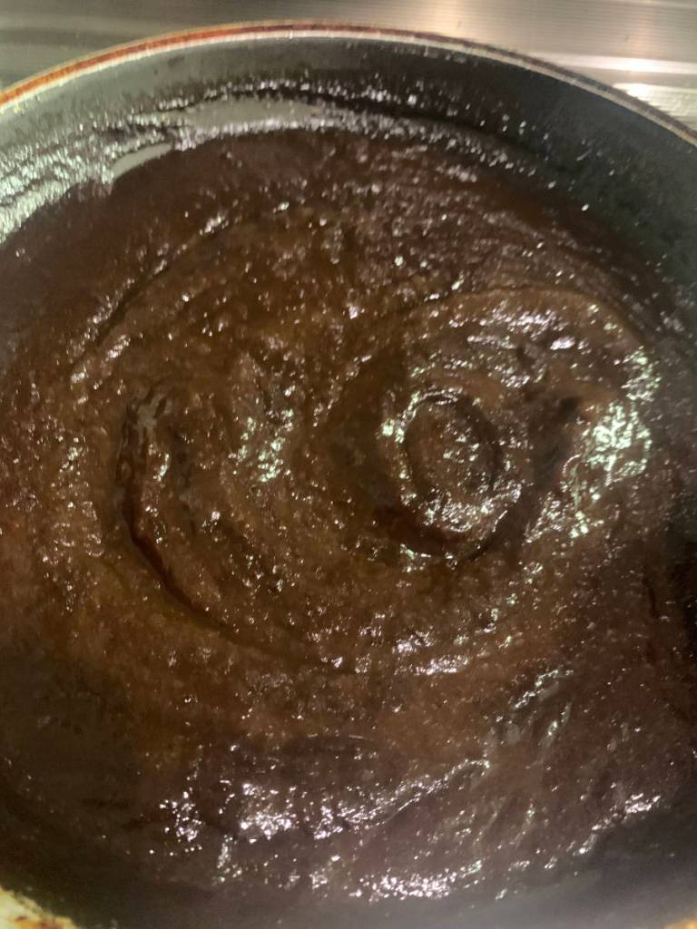 Transcurrido este tiempo trituramos todo con el triturador de alimentos y volvemos a poner en la sartén junto con el vino dulce y el azúcar y dejamos10 minutos más que reduzca a fuego medio bajo. Quedará una salsa espesa pero suave. Reservamos.