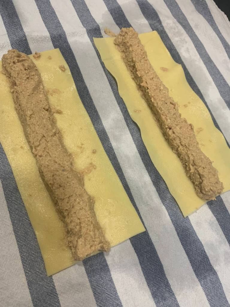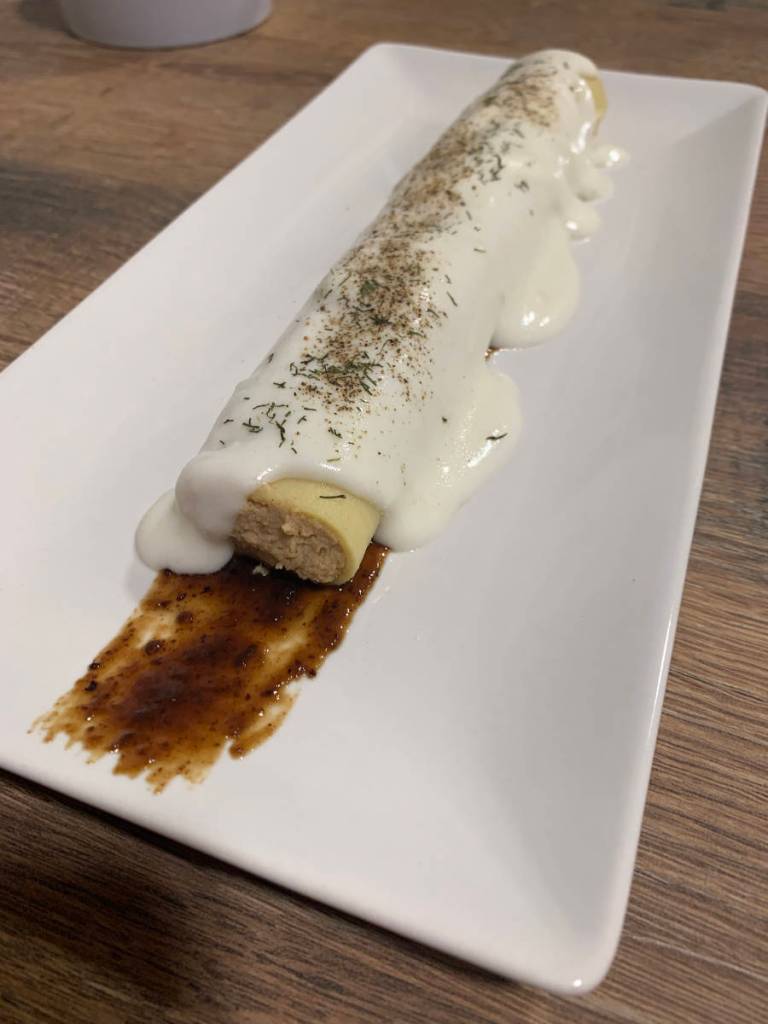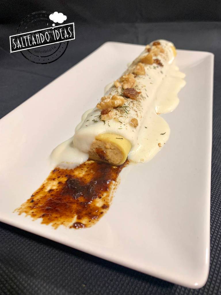 Ahora si! el mejor momento, emplatar. Ponemos el relleno de pollo encima de la pasta, enrollamos con cuidado los canelones.