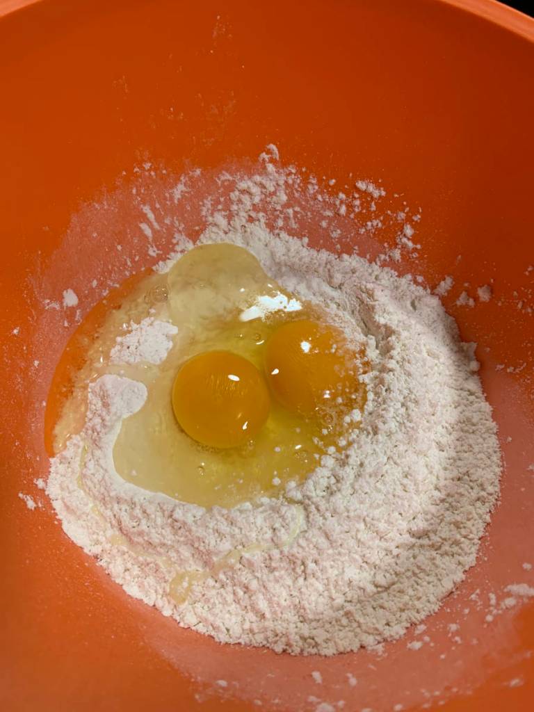 Nos hacemos con un bol y ponemos la harina junto con la sal. Hacemos un pequeño volcán y en medio añadimos los huevos. Mezclamos todo hasta obtener una bola. Enharinamos ligeramente la encimera con harina y trabajamos la masa hasta que nos quede una bola suave y lisa. Tapamos con papel film y a la nevera por 20 minutos.
