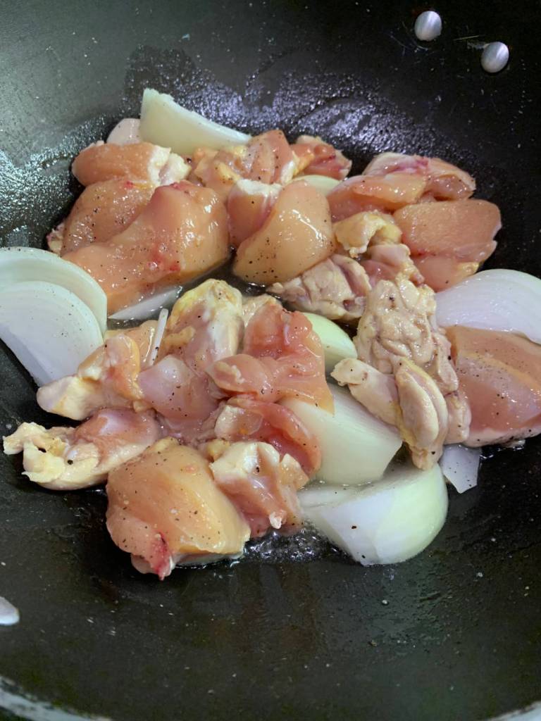 Empezamos haciéndonos con un wok ponemos a cocinar el pollo troceado junto con la cebolla a trozos. Con aceite, sal y un poco de pimienta.