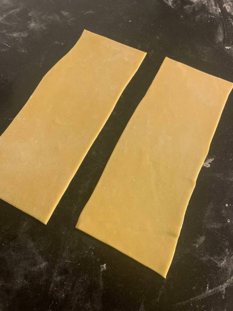Luego partimos la bola en cuatro y trabajamos cada cuarto hasta obtener una masa lisa y fina de 1,5 mm de grosor. Cortamos rectángulos de 8 X20 cm.