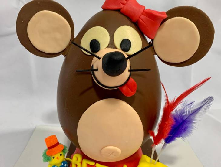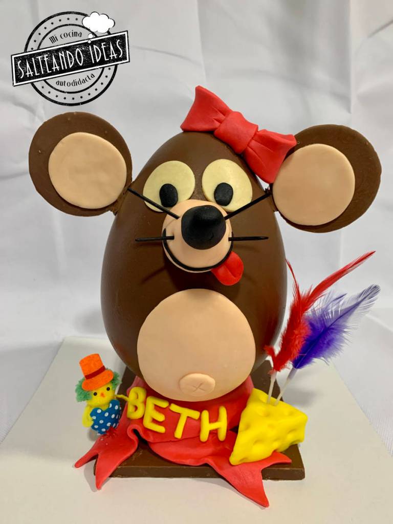 Se trata de un huevo de chocolate y adornado con fondant. El huevo es de chocolate con leche, con una base solida para sujetarlo bien.