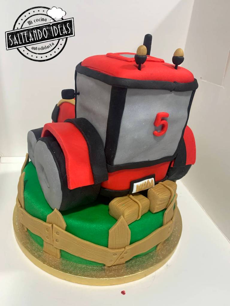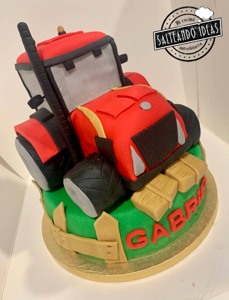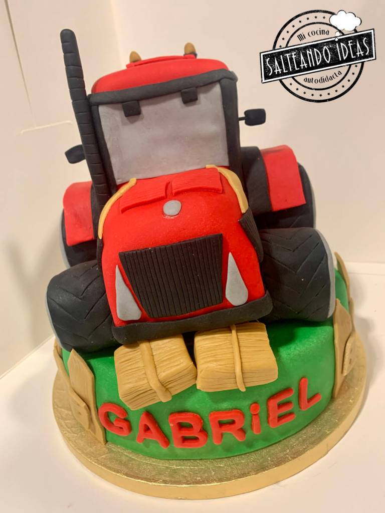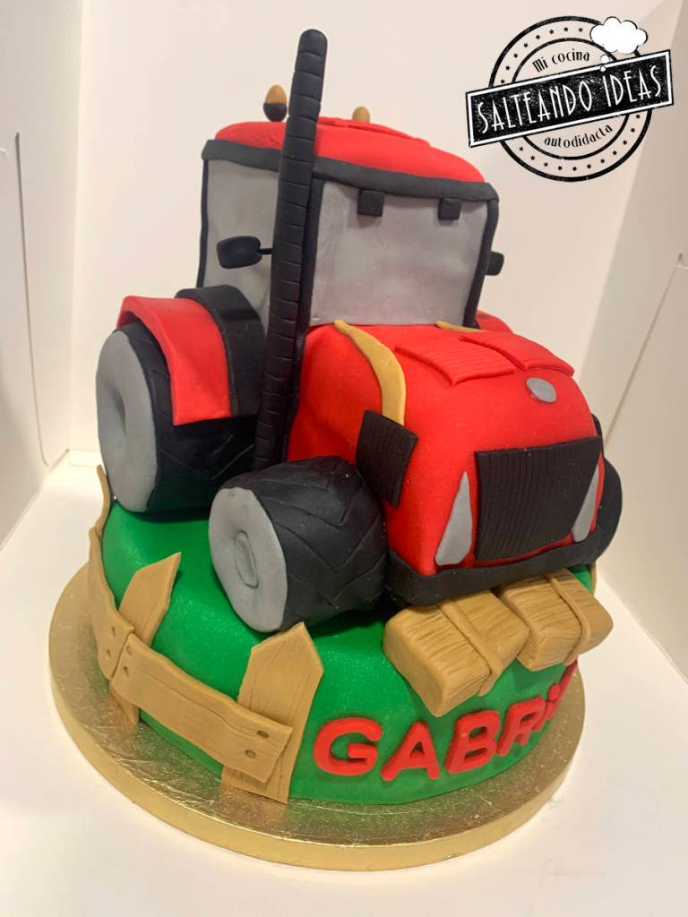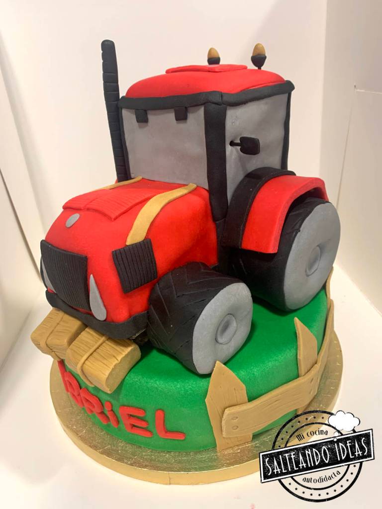 La primera es la tarta de cumpleaños de mi hijo, el adora los tractores y esta vez hice la primera tarta moldeando el bizcocho como un tractor. La verdad es que fácil no es, supongo que como todo, cuantas más haces mejor queda, pero tuve mis problemas para elevar el tractor y poder poner bien las ruedas.