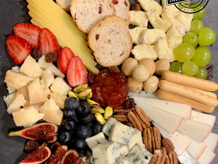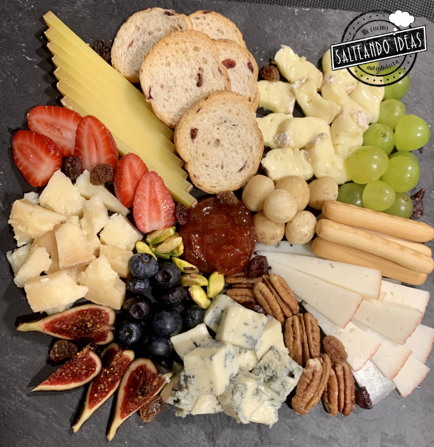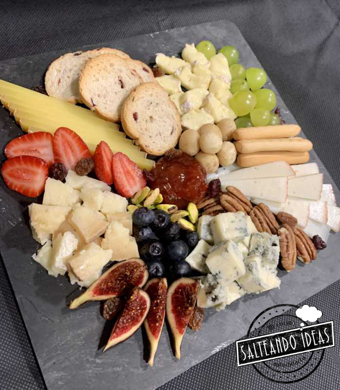 Simplemente cortad los quesos con diferentes formas, los más fuertes en trozos más pequeños, así se pueden saborear mejor con alguno de los otros ingredientes que los acompañan. Recordad que la presentación lo es todo así que intentad encontrar una bandeja cuadrada o rectángular que os quepa todo bien y ya lo tenéis listo.